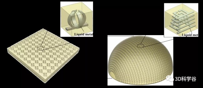 研究团队采用高精度光固化3D打印含有超材料微结构空腔的复杂宏观结构,填充液态金属制备金属导电超材料微结构。