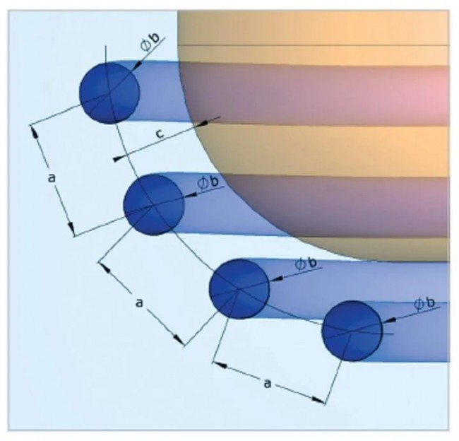 1. 距离分析及优化。依据专业知识及《增材制造流道设计标准规范》,确定冷却流道直径范围(b),流道之间的距离(a),分析流道与冷却面之间的距离(c),获得a、b、c的尺寸约束范围。