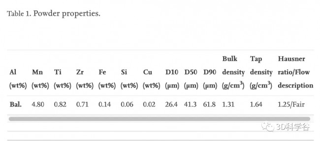 研究中自行设计的 Al-Mn-Ti-Zr 粉末由 Ecka Granules GmbH(德国)用惰性气体 (N2) 雾化。其化学成分是通过电感耦合等离子体原子发射光谱 (ICP-AES) 使用 Varian Vista MPX (Varian Inc., USA) 测量的。在以 63 μm 的筛目尺寸筛分粉末后,应用典型的粉末表征方法。