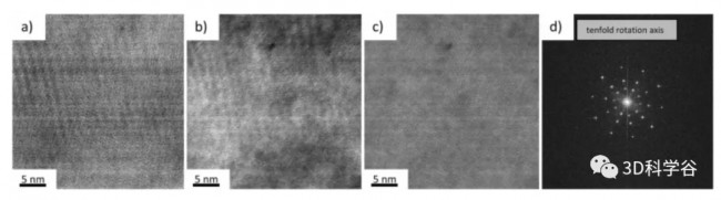 图 8 (a) α-Al 晶粒间晶界处的 AlxMn(Fe, Si) 相的环形暗场扫描透射电子显微镜 (ADF-STEM) 图像;(b) 相同区域的高角度环形暗场扫描透射电子显微镜 (HAADF-STEM) 图像,如 (a) 所示;(c) 相同区域的 FEI-HAADF-STEM 图像,如 (a) 所示;(d) 来自 AlxMn(Fe, Si) 富集相的快速傅立叶变换 (FFT),显示十倍旋转轴。