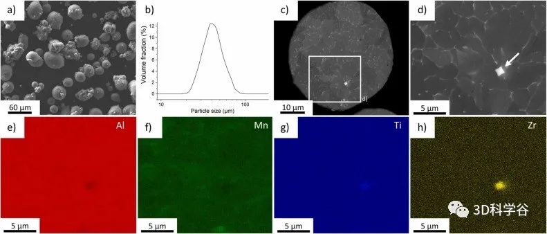 图 1. (a) 粉末形貌的二次电子 (SE) SEM 图像;(b) 粉末的粒度分布;(c) 粉末横截面的背散射电子 (BSE) SEM 图像;(d) BSE SEM 图像显示在 (c) 中用白色矩形标记的区域在更高的放大倍数下;(e-h) 对应于 Al、Mn、Ti 和 Zr 的 (d) 的能量色散 X 射线光谱 (EDX) 图。白色箭头表示富含 Ti 和 Zr 的立方形颗粒。