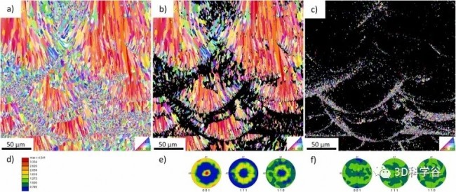 图 3. (a) 电子背散射衍射反极图 (EBSD-IPF) 晶粒取向图在成品试样的构建方向上。铝晶体取向的颜色代码在右下角给出;(b) 仅显示与 (a) 相同截面的柱状 α-Al 晶粒;(c) 仅显示与 (a) 相同截面的等轴 α-Al 晶粒。计算出的柱状和等轴 α-Al 晶粒的 {001}、{111} 和 {110} 极图分别显示在(e)和(f)中。(d) 中相应的色标表示衍射峰的相对强度。