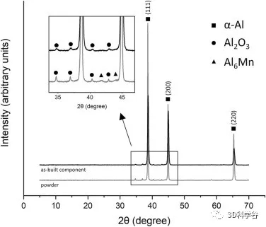 图 2 说明了 XRD 研究的结果。除了 fcc α-Al 相的典型 (111)、(200) 和 (220) 结晶取向之外,灰色粉末图案和黑色成品样品图案都显示出一系列强度较低的峰.这些主要出现在 35°< 2θ< 45° 范围内,放大显示。通过使用 ICSD 数据库,可以将一些峰指定为 Al2O3 相。预期的 Al6Mn 相只能在粉末中检测到。没有检测到含 Ti 或 Zr 相。