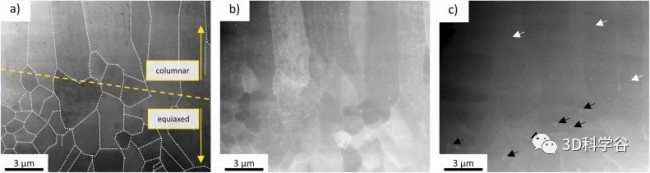 图 4. (a) 环形暗场扫描透射电子显微镜 (ADF-STEM) 概览显微照片;两种颗粒形态。为清楚起见,晶界用白色虚线标记。黄色虚线用于表示等轴和柱状晶粒结构之间的边界;(b) 相同区域的高角度环形暗场扫描透射电子显微镜 (HAADF-STEM) 图像,如 (a) 所示;(c) 与 (a) 所示区域相同的 FEI-HAADF-STEM 图像。沿构建方向排列的圆形沉淀物由白色箭头表示。等轴晶粒内的立方体颗粒用黑色箭头表示。