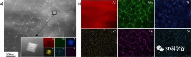 图5(a)等轴α-Al晶粒区域的高角度环形暗场扫描透射电子显微镜(HAADF-STEM)概览显微照片;(b) Al、Mn、Ti、Zr、Fe 和 Si 的相应能量色散 X 射线光谱 (EDX) 图;(a) 中用黑色矩形标记的区域在下面放大显示,并带有 Al、Mn、Ti、Zr、Fe 和 Si 的相应 EDX 图。