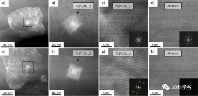 图 6. (a) 和 (e) 等轴 α-Al 晶粒内的 Al3(Tix Zr1 – x) 纳米粒子的高角度环形暗场 (HAADF)-STEM 图像;(b) 和 (f) FEI-HAADF-STEM 图像显示了在 (a) 和 (e) 中用矩形标记的区域,放大倍数更高;(c) 和 (g) (b) 和 (f) 中 Al3(Tix Zr1 – x) 纳米粒子的高分辨率 FEI-HAADF-STEM 图像。(c) 和 (g) 中的插图显示了 (b) 和 (f) 中 Al3(Tix Zr1 – x) 纳米粒子的快速傅立叶变换 (FFT)。额外的超晶格反射以橙色圈出。(d)和(h)(b)和(f)中α-Al基体的高分辨率FEI-HAADF-STEM图像。(d) 和 (h) 中的插图显示了 (b) 和 (f) 中 α-Al 矩阵的 FFT。