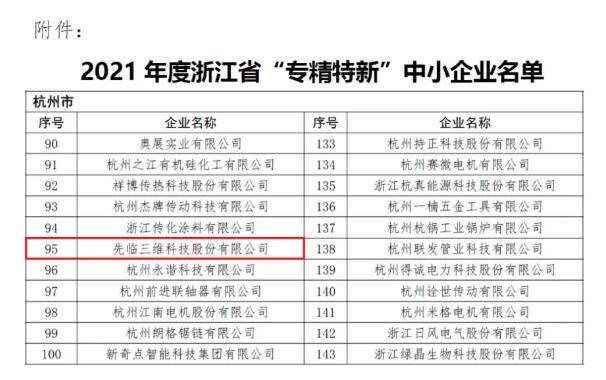 近日,浙江省经济和信息化厅发布了关于公布2021年度浙江省“专精特新”中小企业名单的通知,经过企业申报、各县(市、区)经信局初审推荐、各设区市经信局审核等程序,先临三维成为浙江省首批“专精特新”中小企业之一。