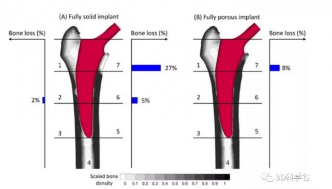 下图显示了实心钛股骨植入物和全多孔 3D 打印钛股骨植入物之间的骨质流失差异。
