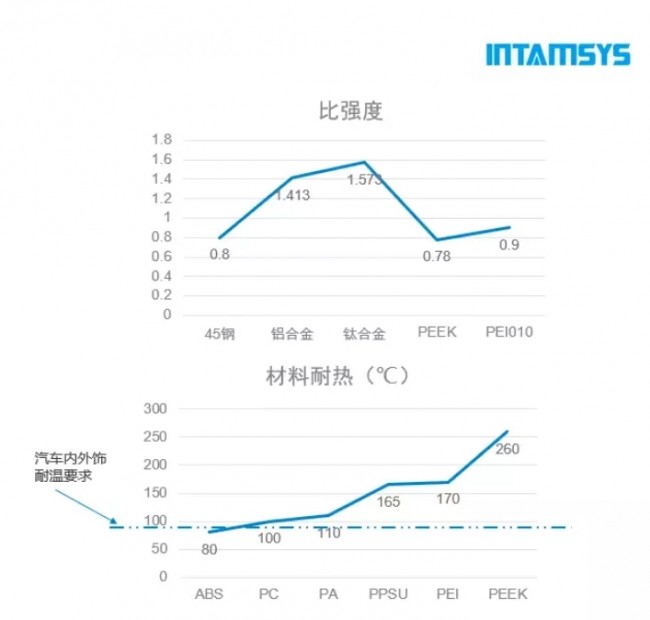 从以上材料耐热曲线可以看到,从ABS 到PEEK,耐温范围从80度到260度。比强度是强度与密度的比值,例如PEEK与45钢的比强度相当,也就是说在负载较大的情况下工程塑料也有机会替代金属。