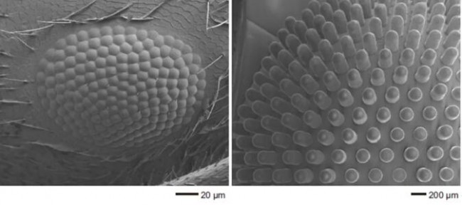 图一、左图:蚂蚁的复眼,右图:基于微流体辅助3D打印技术制备的仿生复眼