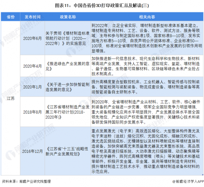 江苏省主要结合国家层面相关政策提出具体发展规划与措施,2020年6月发布的关于贯彻《增材制造标准领航行动计划(2020—2022年)》的实施意见中,就提出了到2022年增材制造相关标准建设的具体目标。
