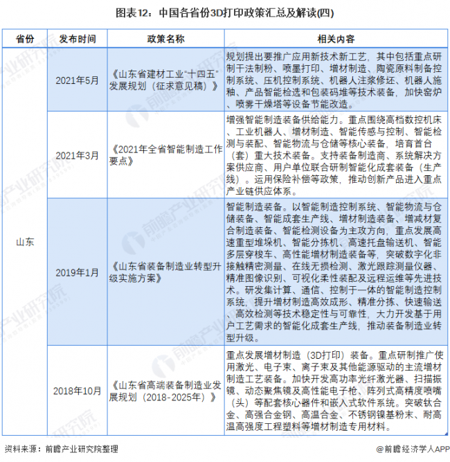 山东省3D打印产业实力较强,2021年3月发布了《2021年全省智能制造工作要点》,指出增强智能制造装备供给能力,重点围绕高档数控机床、工业机器人、增材制造、智能传感与控制、智能检测与装配、智能物流与仓储等核心装备,培育首台(套)重大技术装备。