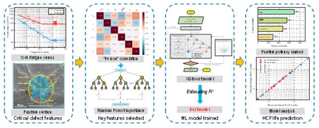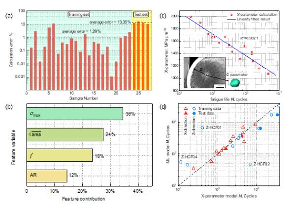 增材制造过程中不可避免地会形成气孔和未熔合缺陷等各类缺陷,在外部加载下易诱导疲劳裂纹形核和扩展,导致疲劳命离散性增大,为疲劳性能的可靠评估和准确预测带来挑战。传统的力学方法在挖掘缺陷特征与疲劳寿命之间的物理规律方面具有局限性。数据驱动的机器学习方法为有效处理高维物理量之间的复杂非线性关系提供了契机。但是目前已有机器学习模型主要是利用材料组分或者单一的疲劳裂纹源缺陷因子(例如著名的双参数Murakami模型)对材料疲劳寿命进行预测,未考虑影响疲劳寿命的裂纹源关键缺陷特征,亦未尝试对机器学习模型中的黑箱进行适当打开分析,仅仅处于较为简单的数据分析阶段,同时在特征处理方面大部分是根据人工经验选取,而没有依靠数据本身的特点,缺乏一定合理性。