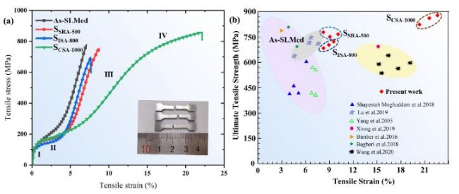 图1.(a)不同热处理态SLM TiNi合金的室温拉伸应力-应变曲线。(b)论文中TiNi合金拉伸性能与相关报道工作的对比图,表明该工作同时提高了SLM TiNi合金的拉伸强度和应变。