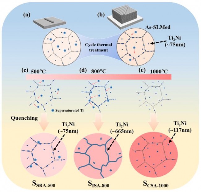 图2. 不同热处理条件下SLM TiNi合金的组织演变示意图。
