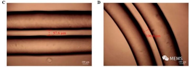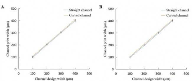 (A)通道实际打印宽度与340μm喷嘴设计尺寸的对比图;(B)通道实际打印宽度与420μm喷嘴设计尺寸的对比图;(C)由340μm喷嘴打印的直通道示意图;(D)由340μm喷嘴打印的弯曲通道示意图。