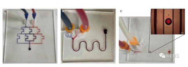 利用340μm喷嘴打印的微流控器件:(A)微混合器;(B)浓度梯度发生器;(C)液滴发生器。