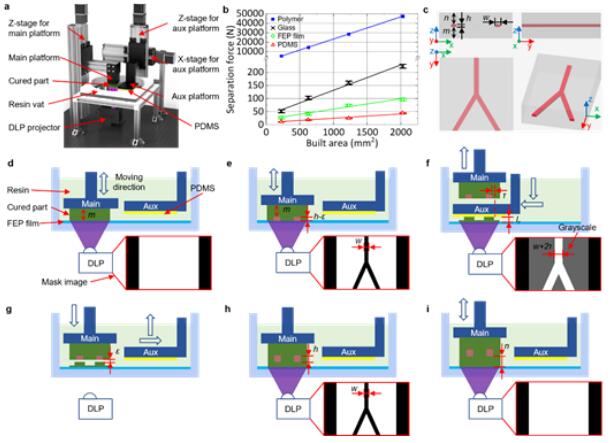 新工艺的核心思路是在传统的立体光固化打印机上增加一个辅助打印平台作为约束平面,将至关重要的通道顶层通过两次曝光分开打印,并原位转印到微流体器件上。通过这种方式极大减少了通道内树脂吸收的光能,使得总吸收能量远低于固化所需的能量阈值,避免了过度固化导致的通道堵塞。