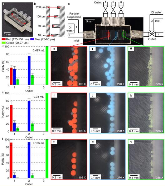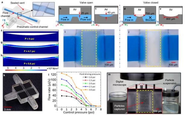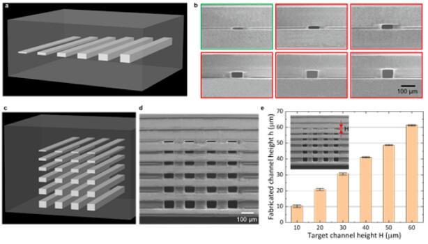 通过这种方法,研究者打印了一系列10微米级微流体通道并展示了一系列微流道应用如微流体阀,微粒筛选器等。