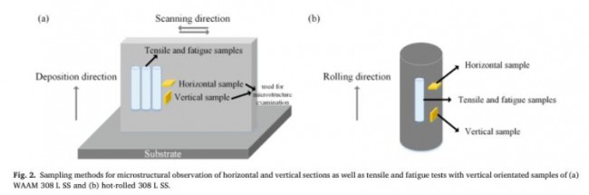 在该论文中,课题组对固溶处理后的WAAM制造的308 L样品进行了微观结构表征、准静态拉伸试验和应变控制低周疲劳试验,与同样固溶处理条件的热轧制造的样品在准静态拉伸性能、循环变形行为、疲劳寿命和疲劳破坏机理进行了比较研究。