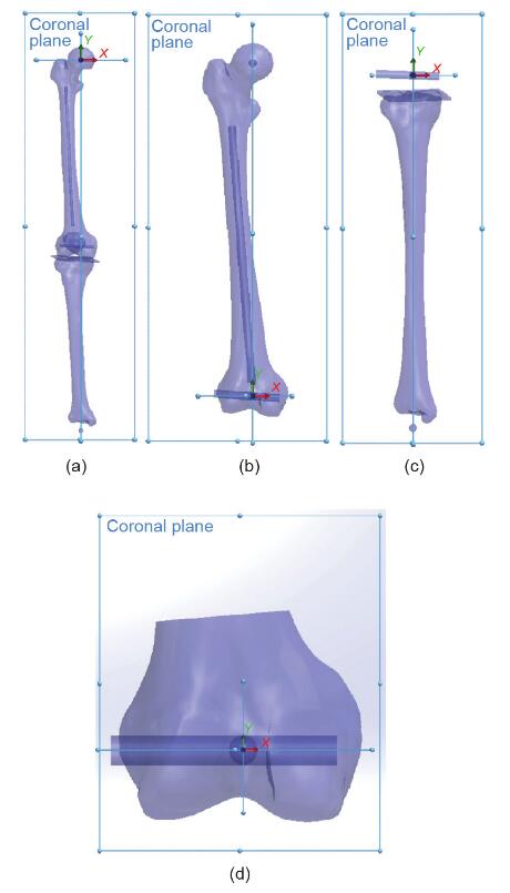 图4. 坐标系示意图。(a)下肢的坐标系;(b)股骨的坐标系;(c)胫骨的坐标系;(d)股骨髁的坐标系。