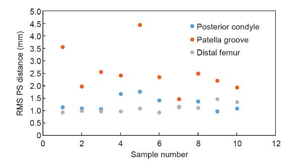 所有数据之间的RMS点到表面(PS)距离为(1.08 ± 0.20)mm(图5和图6)。在所有数据中,髌骨槽区域的RMS PS距离为(1.23 ± 0.27)mm。所有数据中髁后区的RMS PS距离为(0.98 ± 0.30)mm。