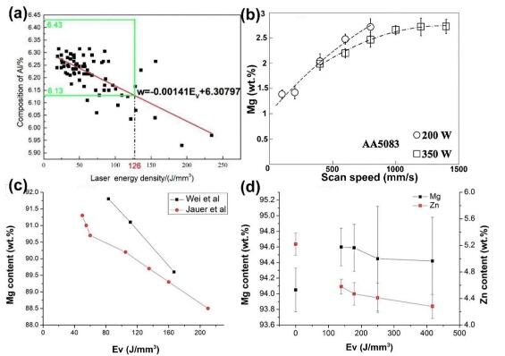 图11 不同能量输入下的成分变化:(a)Ti6Al4V,(b)AA5083,(c)AZ91D,(d)ZK60