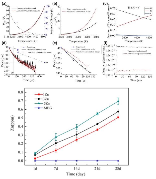 图14 LPBF的两种汽化模型的比较:(a)纯铁的反冲压力,以及(b)和(c)Ti6Al4V在1个大气压和298 K下的汽化;(d)Ti6Al4V在1个大气压和298 K下的锁孔深度,以及(e)在0.0002个大气压和298 K下的汽化模型;(f) z方向的反冲压力