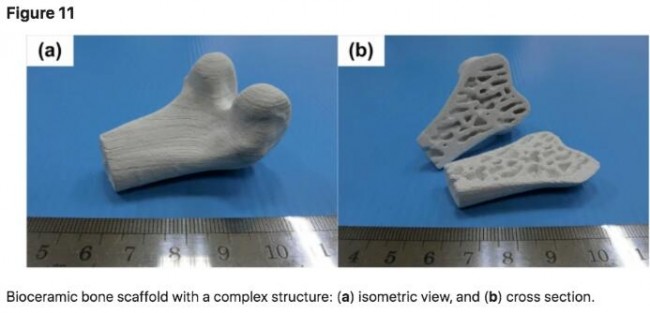 使用水凝胶作为粘合剂,通过 3D 打印方法制造多孔 β-TCP 支架,从而更好地利用 MSCs 再生骨组织。科学家曾使用粘结剂喷射3D打印技术构建具有互连结构的聚己内酯/壳聚糖骨支架,在磷灰石涂层处理后促进 MSCs 的扩散和增殖。开发了一种用于制造 3D 零件的选择性激光凝胶 (SLG) 工艺,称为陶瓷激光凝胶 (CLG)36,并应用于制造 CaCO3-SiO2 间孔生物陶瓷支架37。由于使用无机材料(在这种情况下为 SiO2 溶胶)作为粘结剂,因此实现了烧结后试样的接近零体积收缩。在另一项研究中,当在 SLG 工艺中使用无机粘合剂时,发现体积收缩率低于在其他 3D 打印工艺中使用有机粘合剂时观察到的体积收缩率。