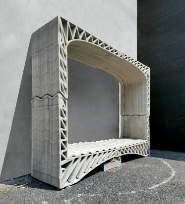 尽管现有3D混凝土打印工艺具有极大的平面自由度,但它并不利于制造水平或悬挑构件。不过,当水平打印的构件翻转90度后,就可以形成水平的楼板或者悬挑。不同的构件可以组装形成一个建筑的切片,多个切片连续排列就很自然地形成了建筑空间。