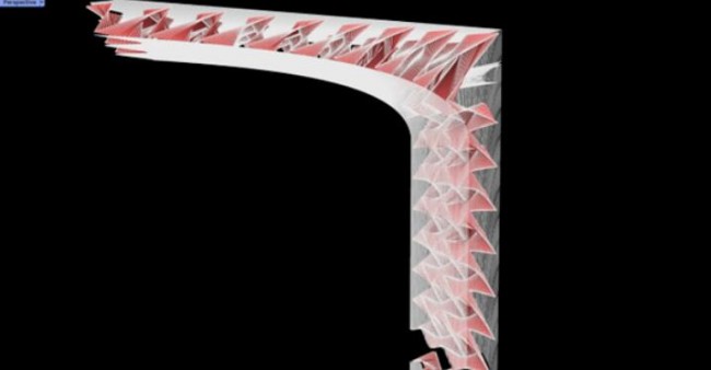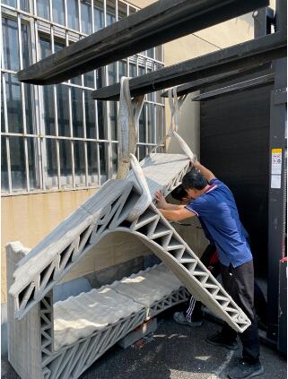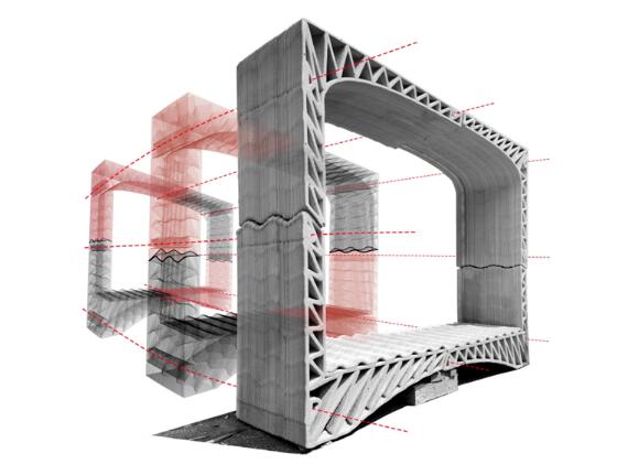 联结多个打印切片的新型建造方式需要考虑诸多因素。首先,每个切片的尺寸、构造需适合混凝土打印机器,所以每个切片被分成四个构件。在打印完成后,特制的速干型混凝土使得构件(也可在工地附近打印)自身具有足够的强度,以便于运输和吊装。