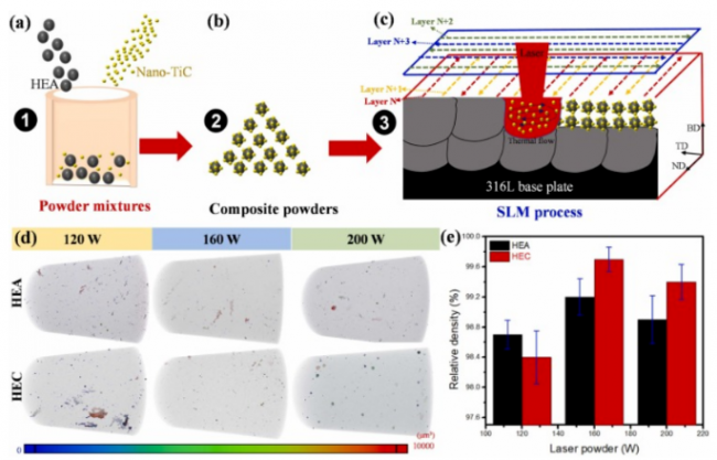 图 2.(a-c)复合粉末和LPBF加工的制备过程的图形表示,包括粉末混合,复合材料粉末和扫描策略,分别,(d)激光功率对HEA和HEC样品中缺陷分布的影响,(e)激光功率与HEA和HEC样品相对密度之间的关系。