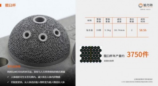 在医疗领域,髋臼杯采用随机点阵结构,具有与人天然骨相似的杨氏模量,可以减少人体内的异物感。使用铂力特BLT-A400设备打印髋臼杯,零件点阵结构孔径为400-600um,适宜骨细胞生长,人体组织可以生长至孔隙内,生物相容性更高。在双激光成形的情况下,年产量约为3750件,真正意义上实现批量定制化生产。