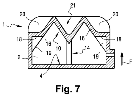 对于中央部分,通过靠在限定中央部分的边缘向顶点会聚的小面限定顶头,并且还限定了从顶头延伸到腔体的底部同时以中心为中心的细长支撑。