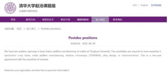 近日,清华大学机械工程系赵沧课题组发布了一组博士后招聘信息,研究方向为金属激光增材制造。清华大学的招聘信息详情如下: