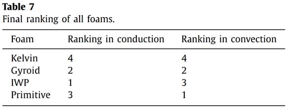 评价导热性能的一个指标是平均HTC,对比热传导和自然对流两种情况下四类泡沫材料的平均HTC值。在纯热传导情况下,TPMS金属泡沫结构的性能明显更好,IWP的平均HTC比Kelvin单元高出50%,其次是Gyroid(46%)和Primitive(32%)。在自然对流条件下,TPMS金属泡沫结构仍表现出优于Kelvin单元的传热性能。