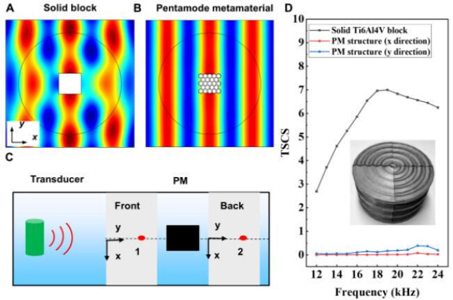 图3 五模超材料类流体声学性能结果。(A)块体钛合金声场云图;(B)五模超材料声场云图;(C)实验装置示意图;(D)总散射界面,定义为各方向散射功率与平面波入射功率的比值