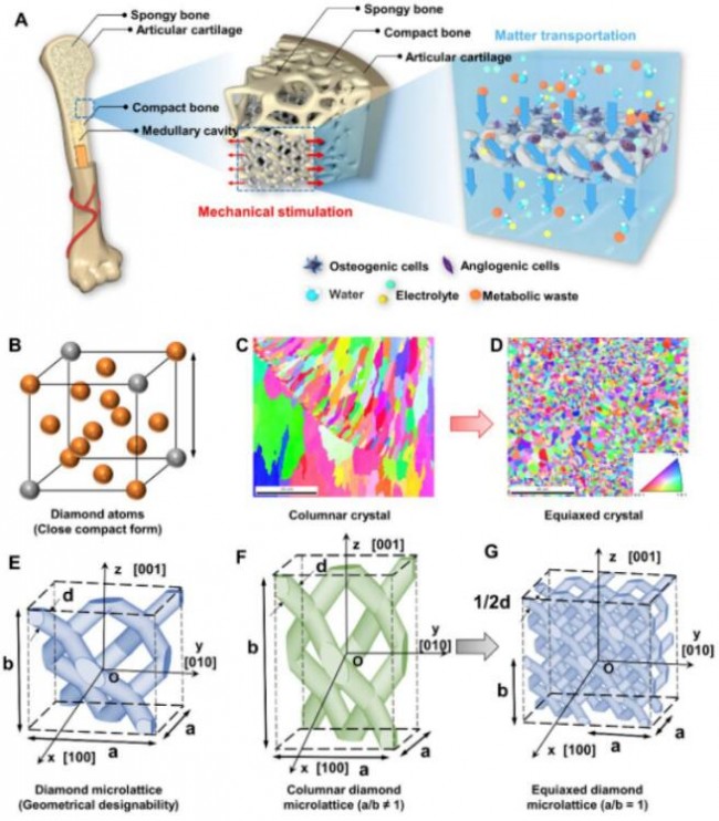 图6 仿晶格超材料生物多孔支架设计示意图。(A)用于修复骨缺损的人工生物医学支架示意图,其中需要同时优化力学和传质性能;(B)紧密形式排列的金刚石原子架构;SLM制造(C)Al-Cu-Mg和(D)Ti/Al-Cu-Mg样品侧面的EBSD(电子背散射衍射)取向图;(E)受金刚石原子启发,具有几何可设计性的金刚石微晶格;(F)柱状金刚石微晶格;(G)等轴金刚石微晶格