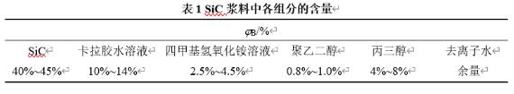 原料有SiC粉末(平均粒径为0.45μm)、工业纯铝(99.7%)、纯镁(99.95%)。以工业纯铝和纯镁按10%的Mg的含量配制出Al-10Mg合金。表1为各组分的含量,将SiC粉末加入由卡拉胶水溶液、四甲基氢氧化铵溶液、聚乙二醇、丙三醇和去离子水组成的混合液中,使用行星式球磨机球磨19h,得到水基SiC浆料。用浓HCl溶液调节浆料pH值,使其成为膏体状。
