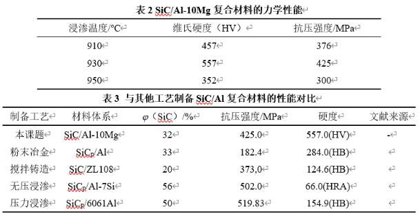 SiC/Al-10Mg复合材料的抗压强度和硬度测试结果见表2。3D打印的SiC预制体网络框架对复合材料起到了明显的增强作用。