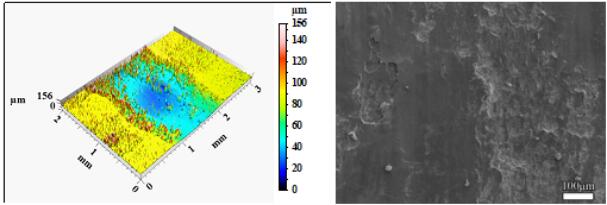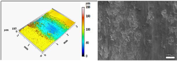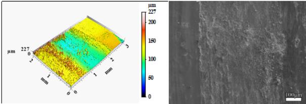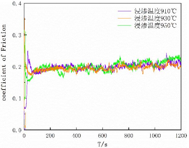 图12为不同浸渗温度下SiC/Al-10Mg复合材料的磨痕。可以看出,复合材料的磨损表面显示出细微的划痕和分层特征,显示出该材料存在轻微的磨粒磨损和严重的粘着磨损。复合壳层和复合内芯相比于Al合金部分脆性较高,容易发生破坏而形成碎片剥落,因此在SiC复合材料区域出现了一些凹坑。浸渗温度为910℃的试样,虽然磨损面看起来比较平整,但是磨痕深度最大差值为227μm,说明磨损不均匀,这可能是前述分析中组织不均匀造成的;浸渗温度为930℃的试样,磨痕深度最大差值为156μm,犁沟深度较均匀,出现一些剥落凹坑,反映出组织中有更多的脆性反应产物;浸渗温度为950℃的试样,磨痕深度最大差值增大到185μm,且出现较多剥落凹坑,造成材料大量磨损,说明组织中大量脆性反应产物在摩擦时造成材料破坏,此时磨损量最大。