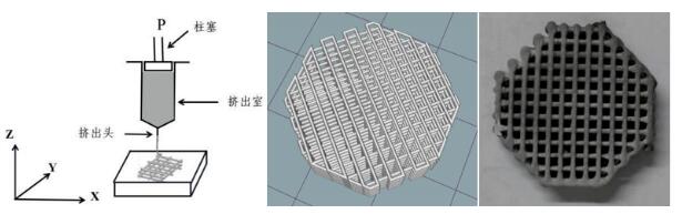 (a) 3D打印工艺示意图 (b) 预制体设计模型 (c)预制体毛坯