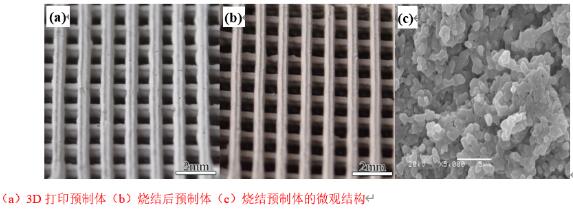 SiC预制体的3D打印工艺和设计模型见图1。将制备好的SiC浆料注入3D打印机的料筒中,并以一定的速度挤出。挤出头根据STL文件分层切片的轨迹数据沿X-Y方向移动,挤出体层层堆积形成SiC预制体毛坯(见图1c)。用真空冷冻干燥机中将打印好的预制体毛坯在-30℃和50Pa的真空度下冷冻干燥24h,然后用管式电阻炉在1350℃烧结3h获得SiC预制体。
