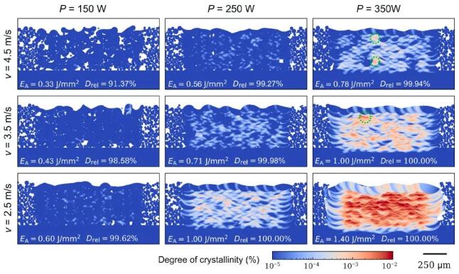 图4展示了模拟预测的不同激光功率和激光速度下L-PBF制造的AMZ4零件的结晶度。基于图4的模拟结果,图 5展示了如何通过仿真模拟来确定L-PBF加工AMZ4的工艺窗口。