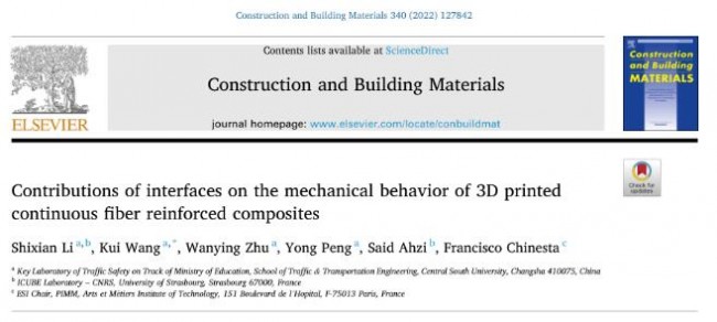 中南大学交通运输工程学院轨道交通安全教育部重点实验室、法国斯特拉斯堡大学ICUBE实验室以及法国巴黎艺术与技术学院的研究团队,在Construction and Building Materials 期刊发表了3D打印连续纤维增强复合材料力学性能方面的研究论文。本期谷.专栏将分享该研究成果中的关键内容。