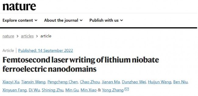 近日,南京大学科研团队发展了一种新型非互易飞秒激光极化纳米铁电畴技术,并在铌酸锂晶体中成功演示了激光3D打印纳米铁电畴,相关工作以“Femtosecond laser writing of lithium niobate ferroelectric nanodomains”为题发表在2022年9月15日的《Nature》上。
