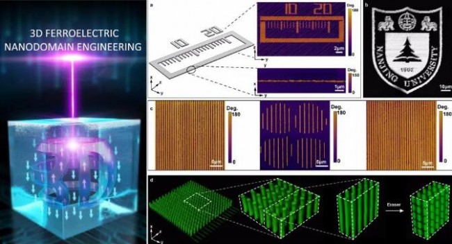 铌酸锂得益于其优越的透射谱范围、非线性光学系数、电光和压电性能,是下一代5G/6G通讯和光子芯片的重要载体。特别的是,在铌酸锂晶体中制备铁电畴结构,在非线性光学、声学滤波器、非易失铁电存储等领域有广泛的应用前景。早在上个世纪八十年代,南京大学的研究小组就采用晶体生长条纹技术在铌酸锂晶体中得到了周期为几微米的铁电畴阵列结构,验证了准相位匹配原理,开启了周期极化铌酸锂晶体(又称非线性光子晶体)在激光变频、量子光源等领域的广泛应用。要进一步提升铌酸锂铁电畴器件的性能,亟需在三维空间实现纳米精度的铁电畴结构可控制备。然而,受限于传统加工技术,该问题一直是困扰研究人员的巨大挑战。