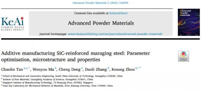 相关论文以’Additive manufacturing SiC-reinforced maraging steel: Parameter optimisation, microstructure and properties’为题,发表在Advanced Powder Materials期刊。