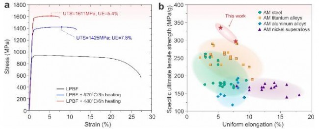 图 1:通过激光粉床3D打印以及后续热处理制备的商用 Beta-C 钛合金的拉伸性能。