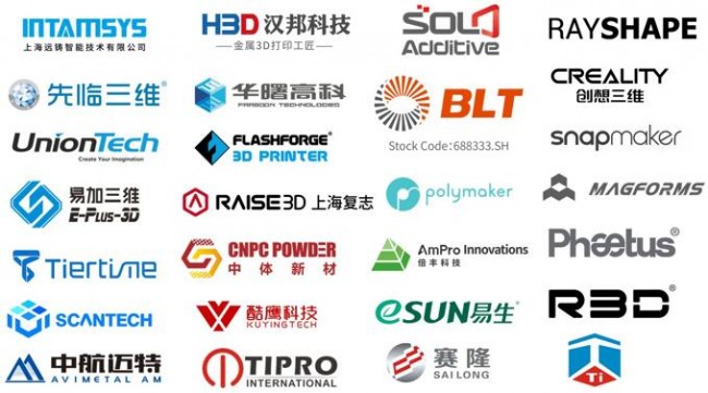 铂力特,华曙高科,易加三维,联泰科技,汉邦联航,太尔时代,上海复志Raise3D,酷鹰机器人,Polymaker,先临三维,菲托斯三维科技,思看科技,天工科技,迈想科技,铼赛智能,创想三维,闪铸三维,快造科技,eSUN,倍丰智能,远铸智能,鼎益科技,中体新材料,双恩智能,赛隆增材,中航迈特,爱三迪电子